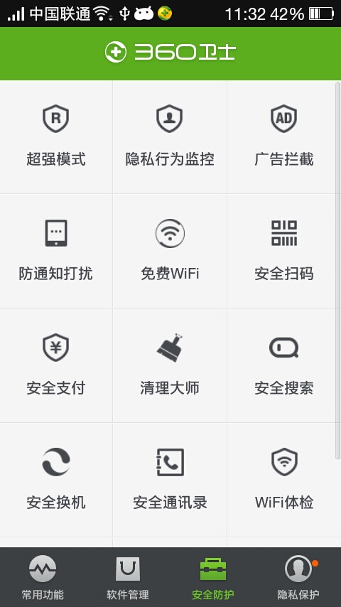 1.点击打开手机“360手机卫士”,出现下图界面点击“安全防护”。