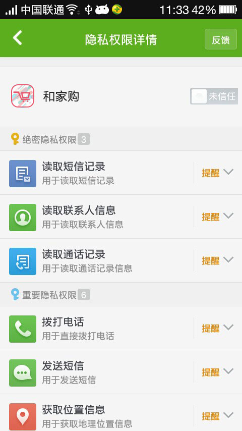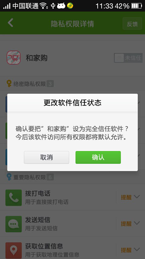 5.进入和家购软件权限详情,如显示是“未信任”状态则点击该按钮