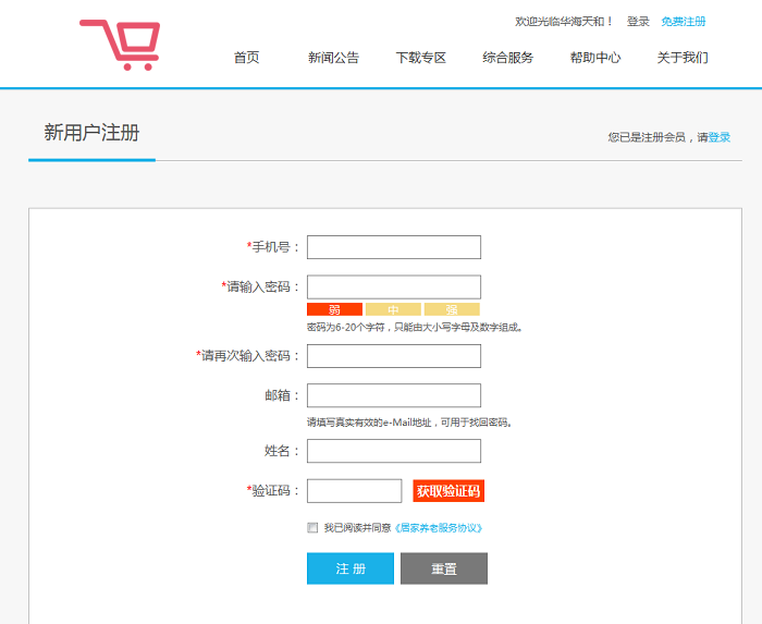 登录中国居家养老网http://www.hhth.cn,点击“免费注册——输入手机号、密码——获取验证码”,根据提示完成注册;
