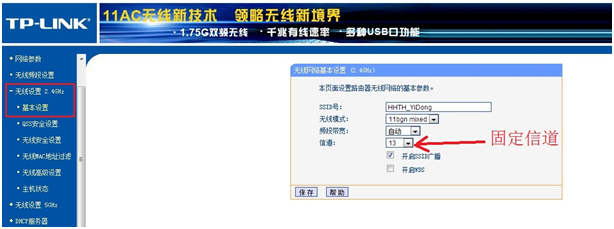 1. 若现场有多个无线路由器同时在工作,需要保证各路由器之间的信道不冲突。如下图所示,设置路由器的“无线设置” ->“基本设置”,点选“信道”为固定的某信道,如第一台无线路由器设置为13,则其他路由器同样设置的数值不能与此数值相同。即现场的有无线路由器的信道都不能相同。