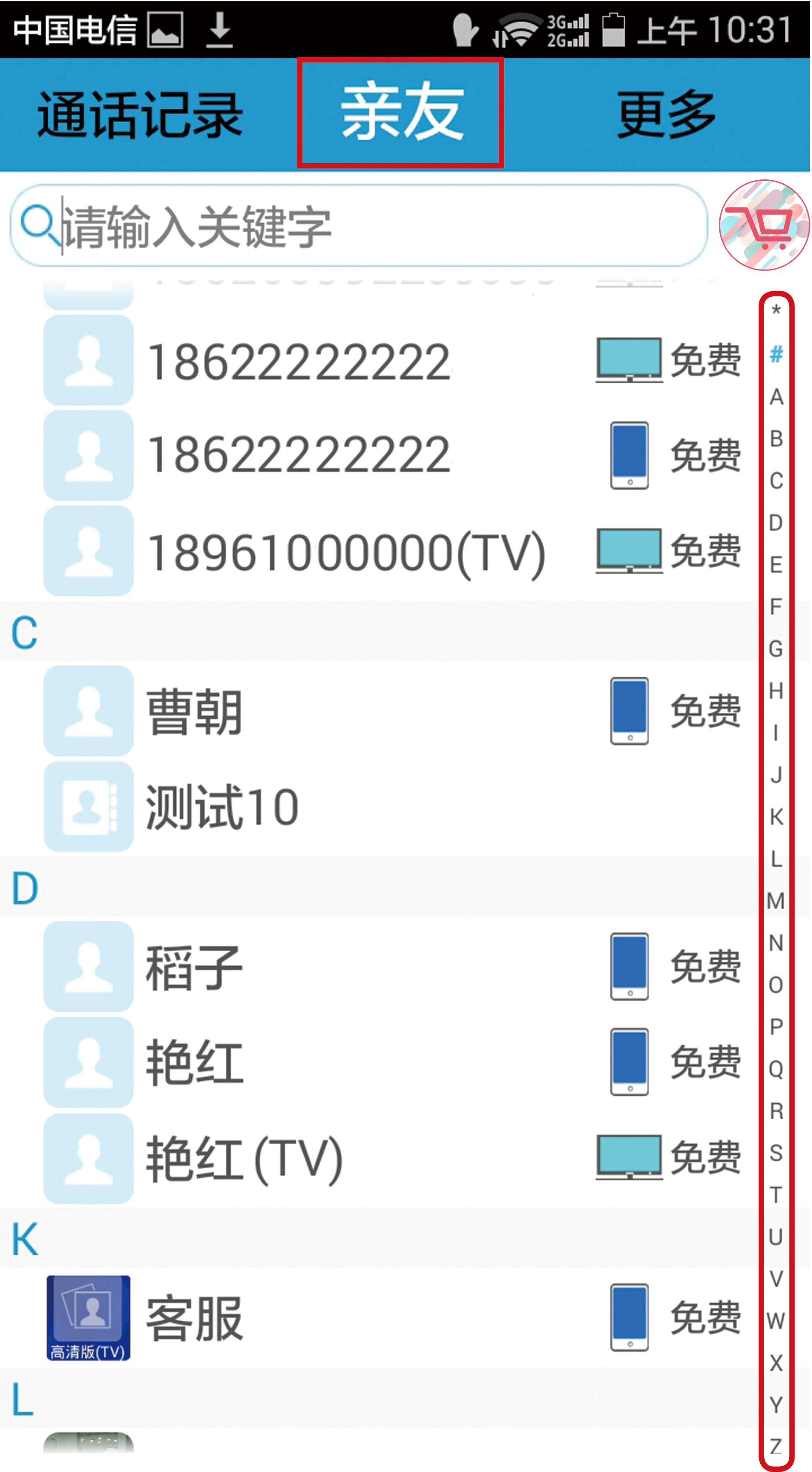 1、选择【亲友】界面,点击亲友拨打。亲友按拼音首字母排序,可点击右侧首字母快速查找。