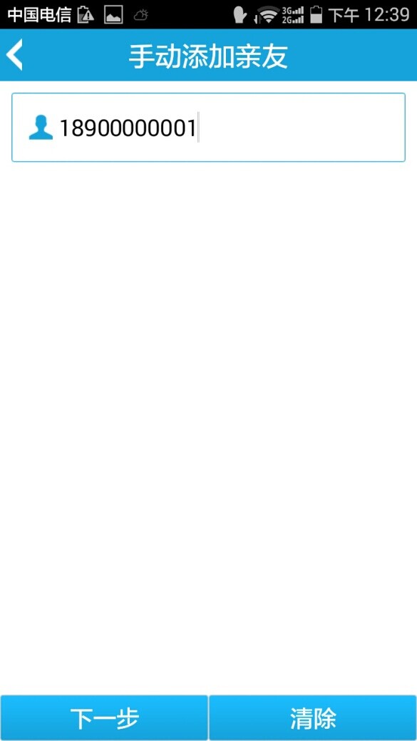 2、进入【手动添加亲友】,进入界面后输入想要添加的亲友。点击【下一步】。