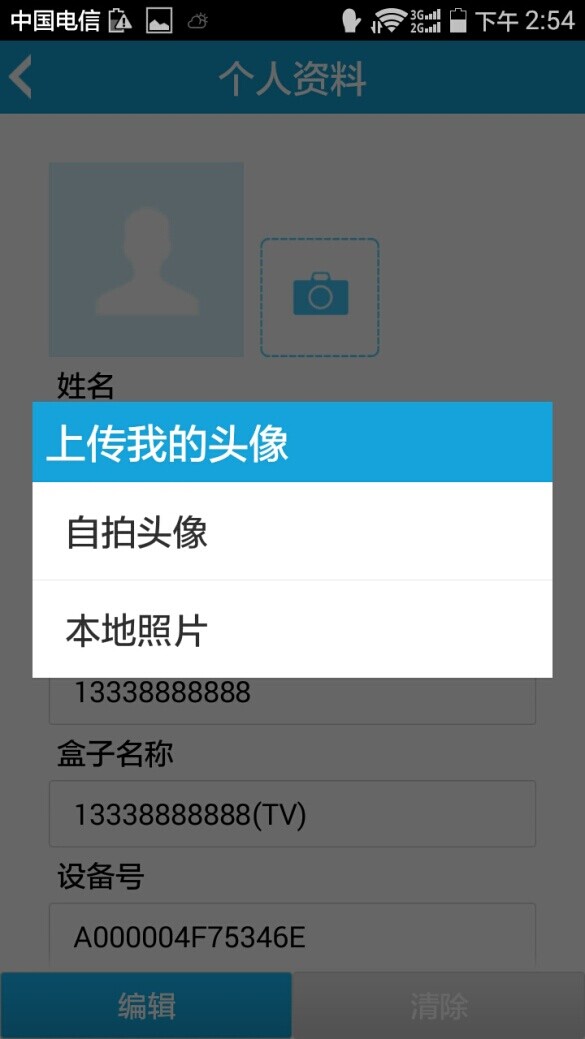 在主界面点击“其他——个人资料——拍照”即可进行头像设置;